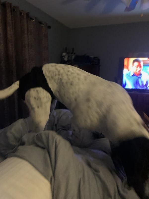 Now flash back to last Thursday….the prisoner was being tested for the Rona, so I immediately quarantined him upstairs and spent the rest of the evening (and most of Friday) washing bedding, bleaching the house, cleaning bathrooms, and Lysoling EVERYTHING. Exhausted but feeling quite proud of my accomplishments, I settled into bed to relax and snuggle with my sweet Bailey girl. My moment of relaxation was quickly interrupted by the sound of her giant tongue licking her lady bits. “Stop Bailey!” I beckoned, as she continued to lick. Totally unfazed by my desperate pleas for peace and quiet, she licked more….while the sound of her massive tongue back and forth was like nails on a chalkboard to my ever exhausted soul. Frustrated I made her get off the bed. When she jumped down i noticed a bright red spot on my freshly laundered sheets. She was in heat. Her first heat…..ever…..and the evidence is now left on my bed.